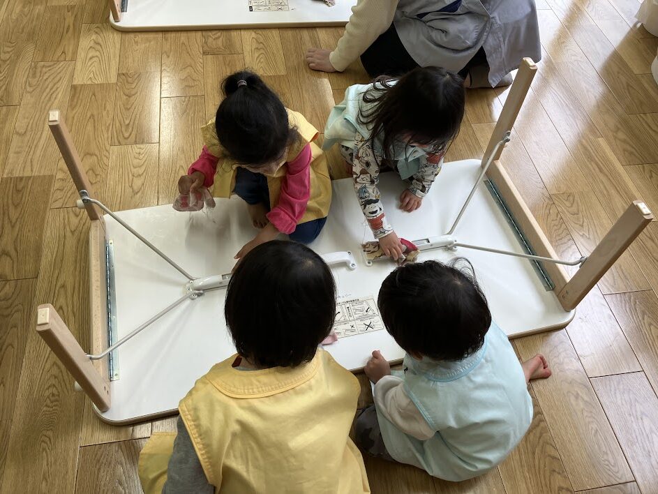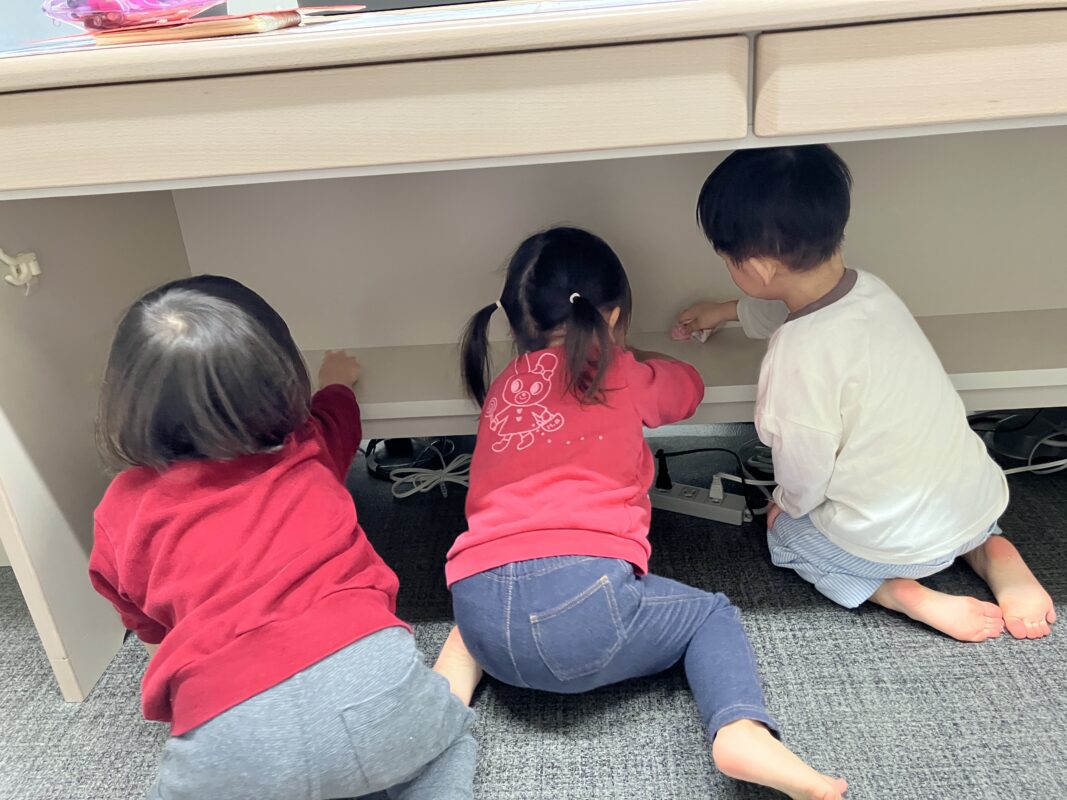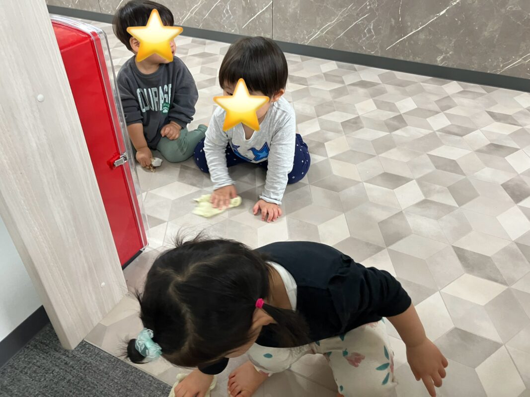保育室だけじゃ物足りない!という意気込みで、廊下や下駄箱、そして職員室まで掃除をしたいという1歳児クラスの友だち♪