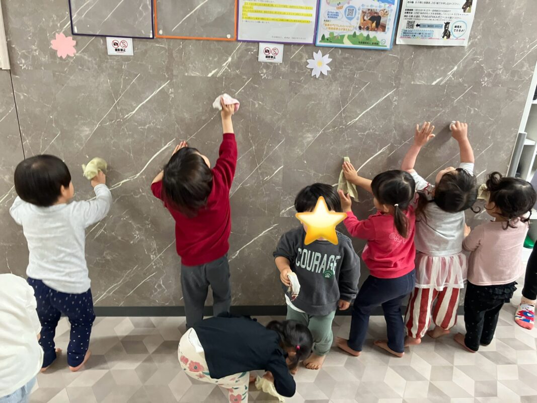 各クラスお世話になった保育室を掃除です!年末掃除を思い出し、自分で雑巾を絞ったり、あっちもこっちもと言って張り切ってスタート!!