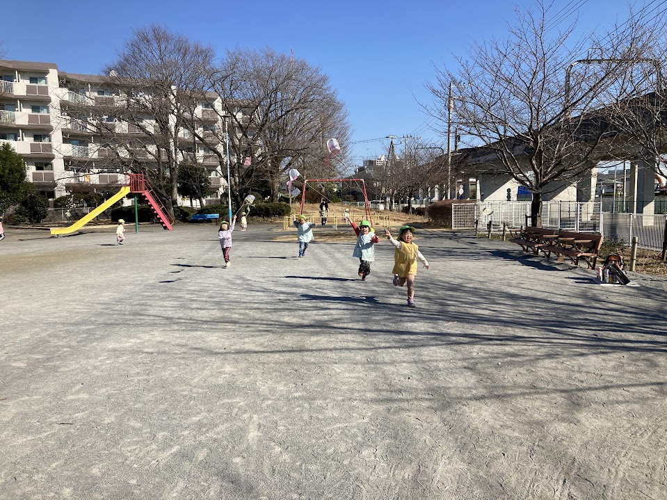 そう!凧揚げです!!凧揚げは風が良く吹いている日に行いました!自分たちが作った手作りの凧を手に、ワクワクした表情の子どもたち。「よーいどん!」の掛け声に合わせて凧を持って走ることを繰り返し楽しんでいました。走るたびに風で凧がふわっと浮かび上がると、その様子を見て「もう一回!」と何度も挑戦していました。